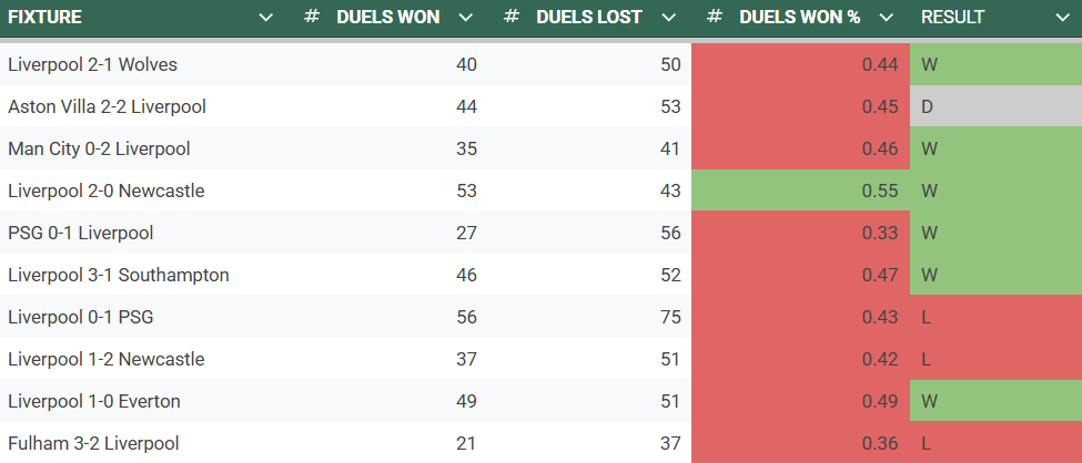 And, as can be seen below, the Reds have fared remarkably poorly by this measure of late, winning more duels than the opposition in just one of their last 10 outings.